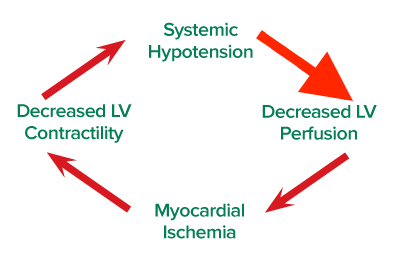 - Door hoge druk in LV en relatief lage druk in aortawortel is de coronaire perfusiedruk laag waardoor het hart sneller last heeft van ischemie (bijv. bij systemische hypotensie of buitensporige tachycardie)